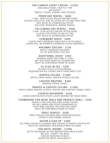 The Cardiff Center at Fort Frenzy has all the goods you’d expect from a premiere event venue with unlimited possibilities. The Cardiff Center boasts a 6,500 + square foot event center / reception space that was specifically designed to transform into an event venue that comfortably accommodates 400 + people. The lobby, also included with the rental, adds roughly 500 additional square feet of space. State-of-the-art technology & sound & gorgeous chandeliers, as well as a full bar {& friendly bar staff, of course} are among several of the offerings included with the space. Clean Restrooms ✅ & dependable temperature control ✅ are a given at The Cardiff Center, yet here are some bonuses you may just not find anywhere else!